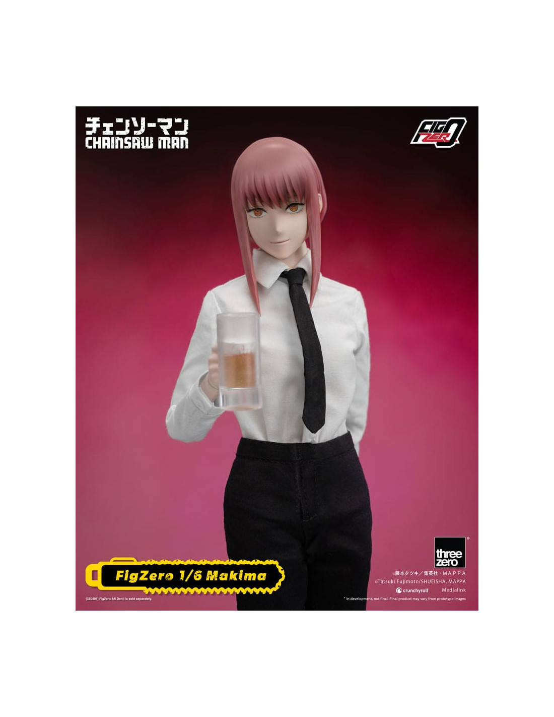 Makima includes two interchangeable faceplates that can be exchanged between a standard expression and an ominous expression and six sets of interchangeable hands, including her ritual-pose hands which perfectly replicate the iconic scene revealing Makima's grisly abilities. Furthermore, the figure comes with a beer mug, a beer piece to be placed inside the mug, and a candy lollipop. The character's Public Safety Devil Hunters uniform includes a white shirt, a pair of slacks, a necktie, and an overcoat, which are all made of fabric. The overcoat has a metal wire sewn inside the hem for expressive poseability.