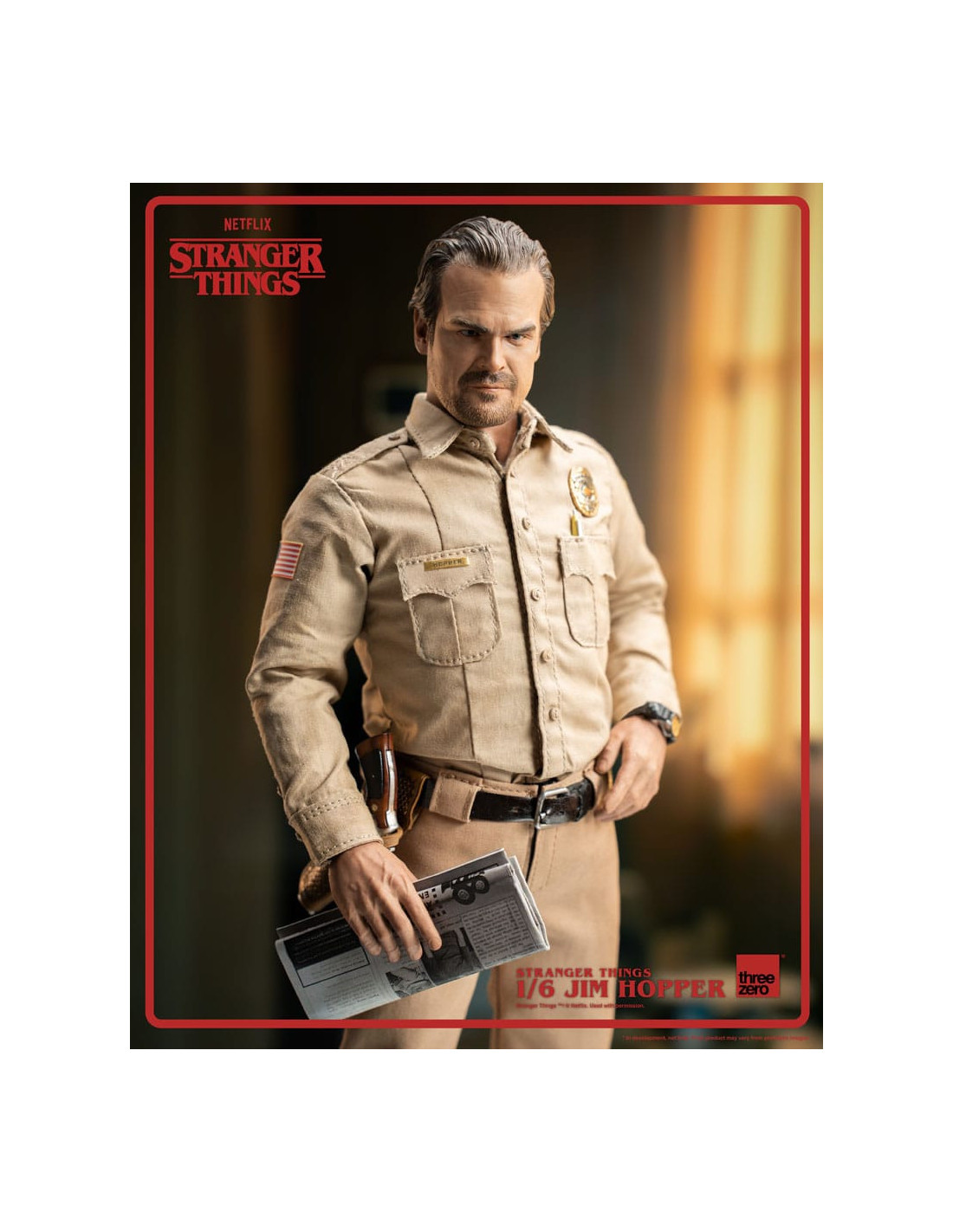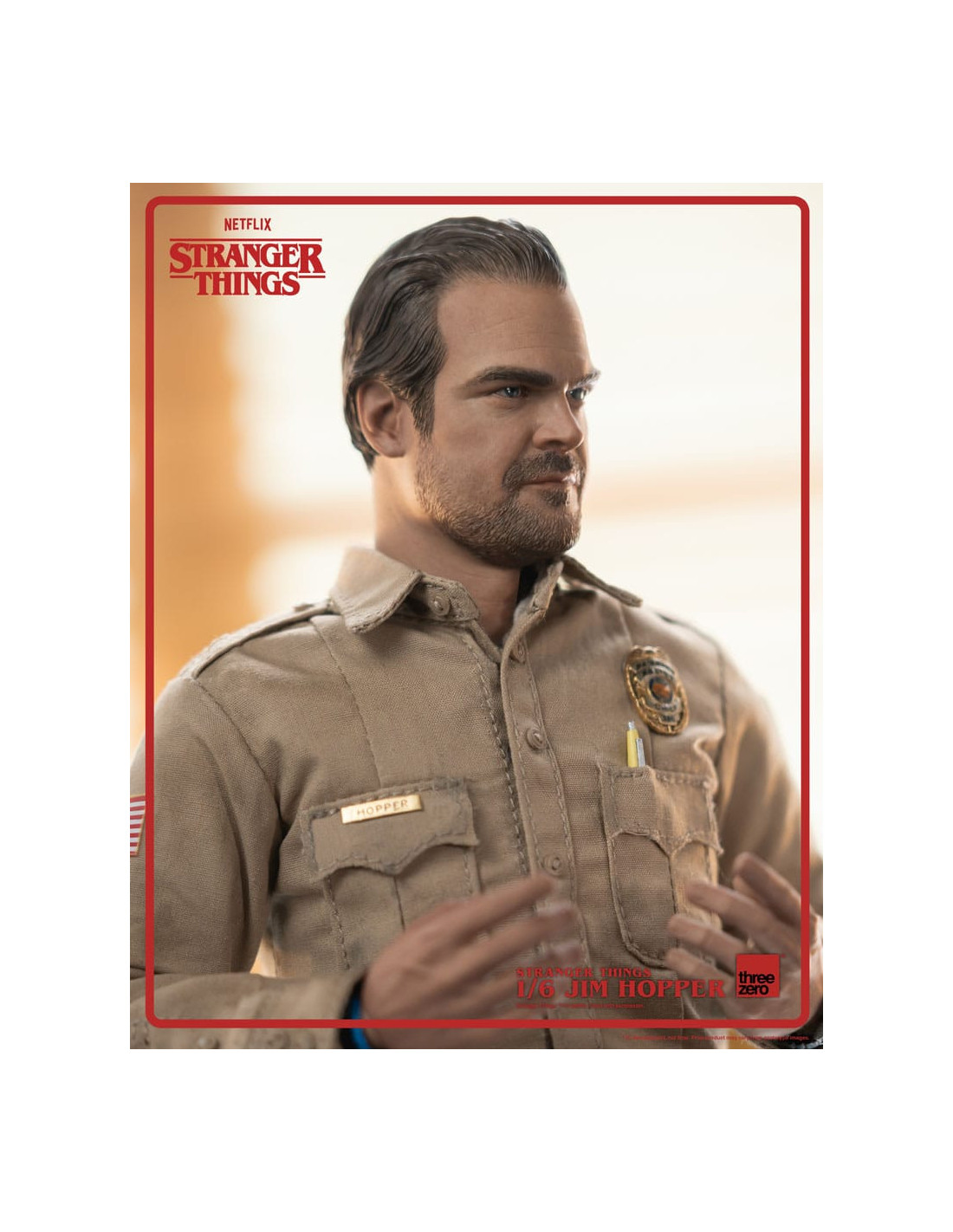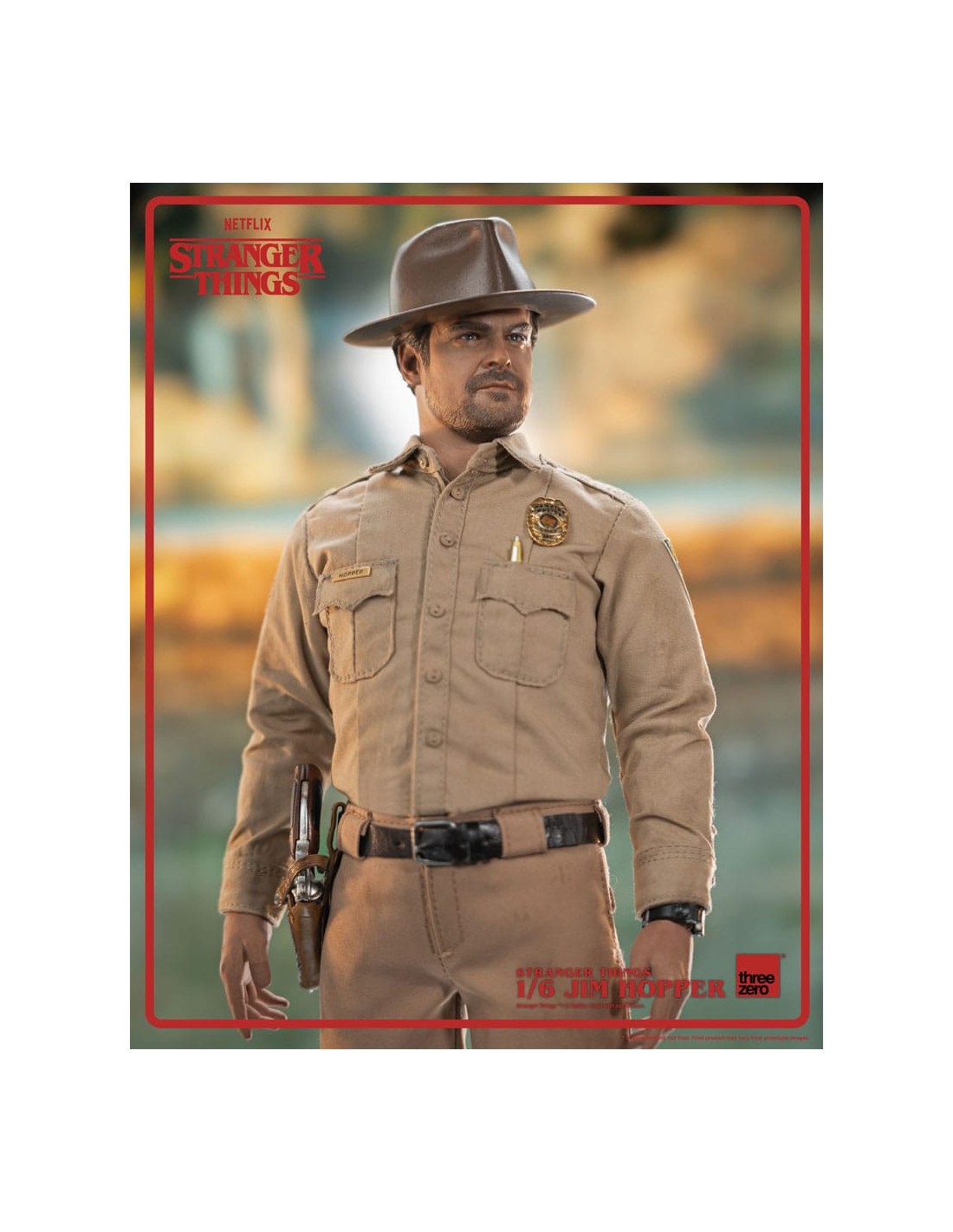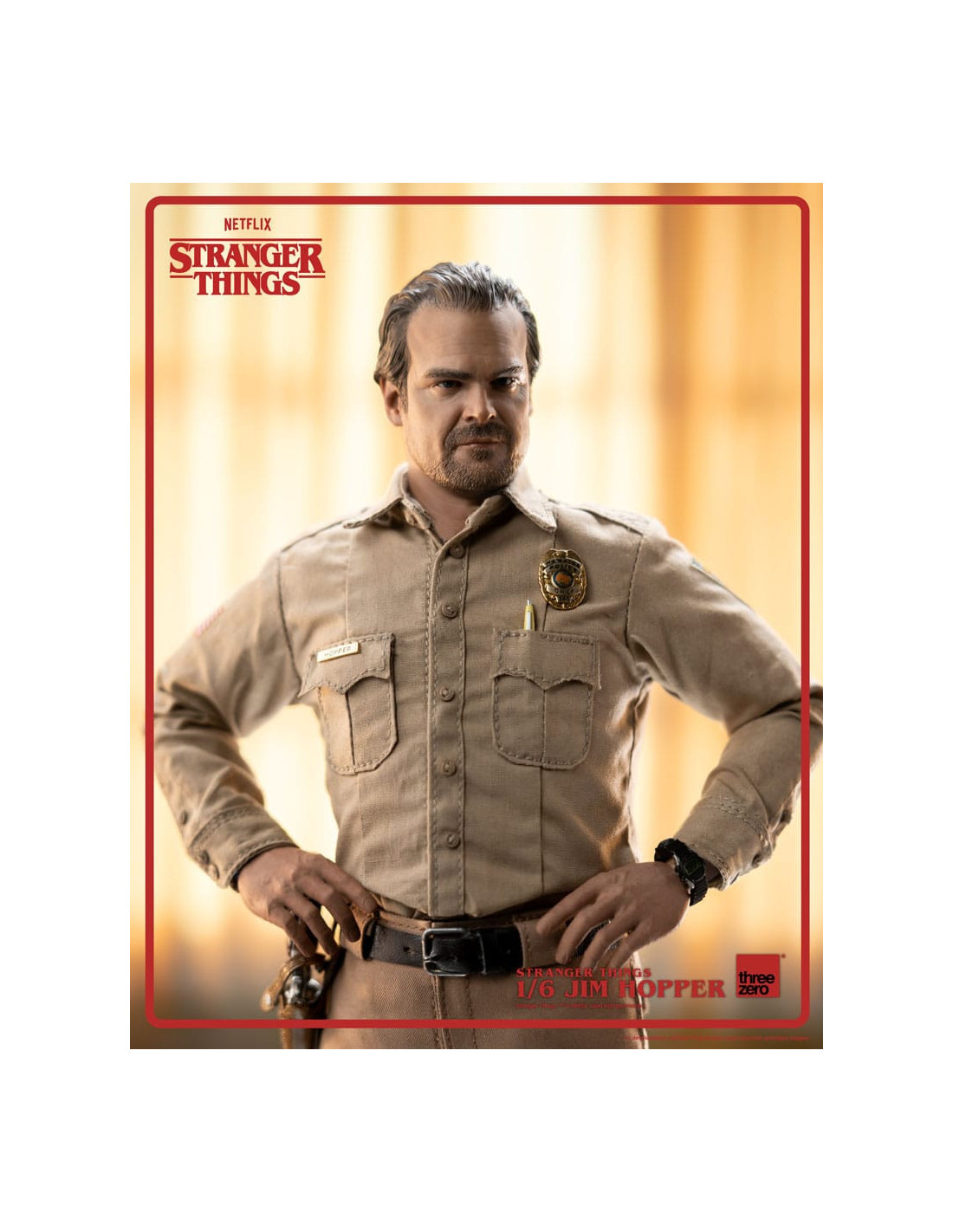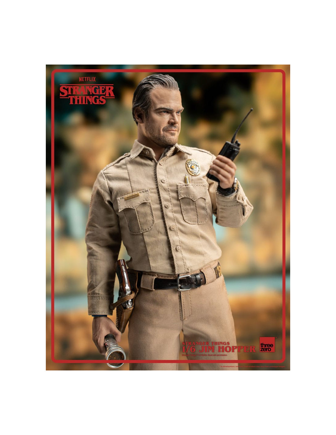 The Stranger Things - 1/6 Jim Hopper collectible figure stands approximately 12.5" (31.8cm) tall features a fully-articulated 1/6 original body with approximately 35 points of articulation. This collectible figure showcases precisely sculpted details and weathering effects, effectively capturing the powerful and tough presence of Jim Hopper.