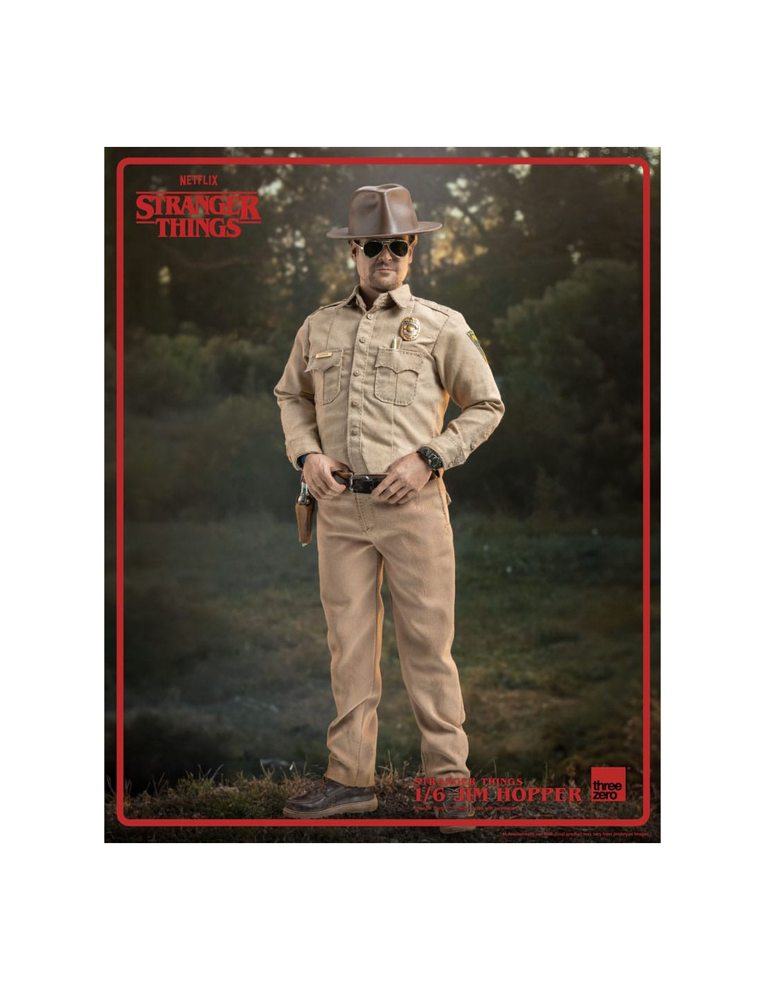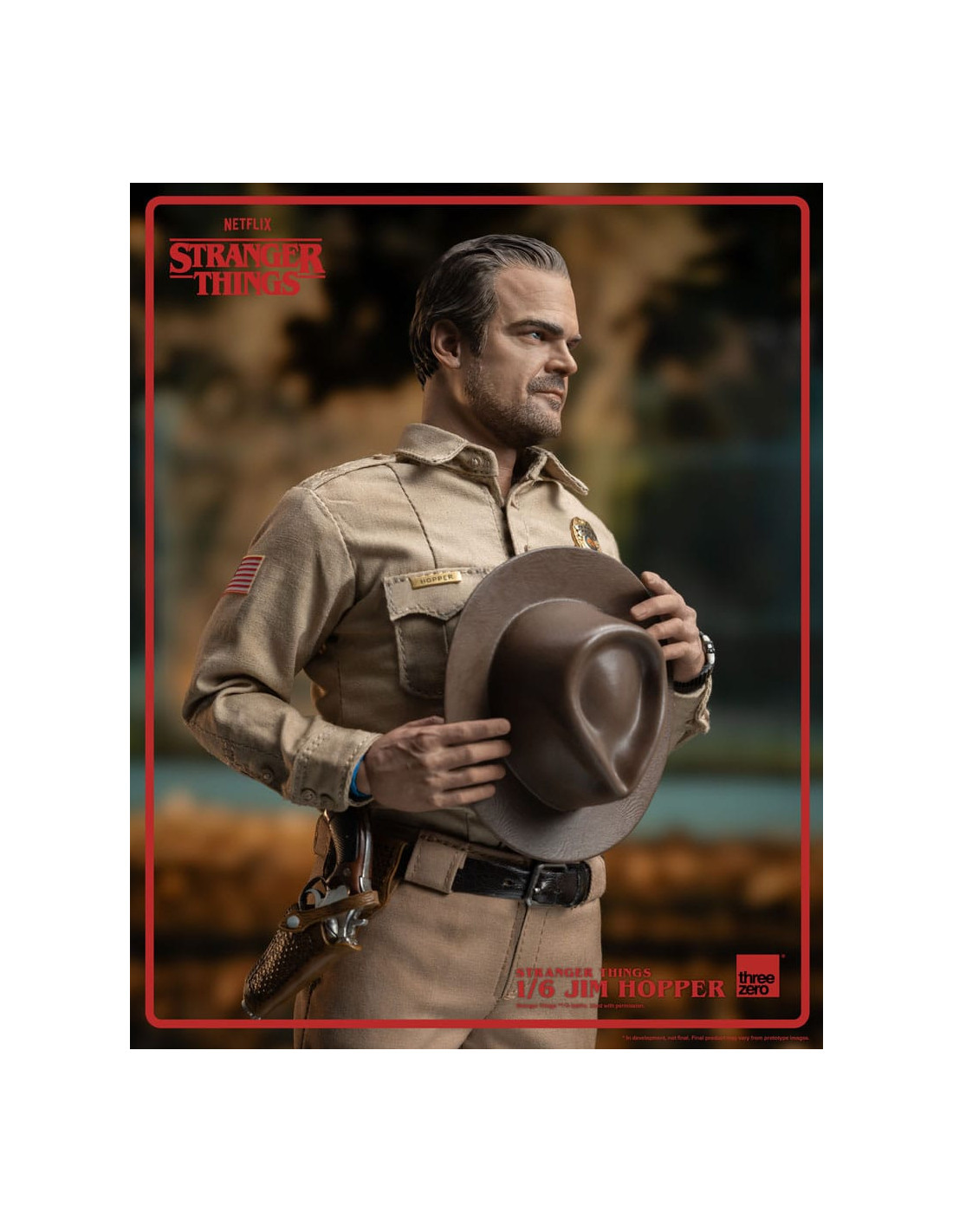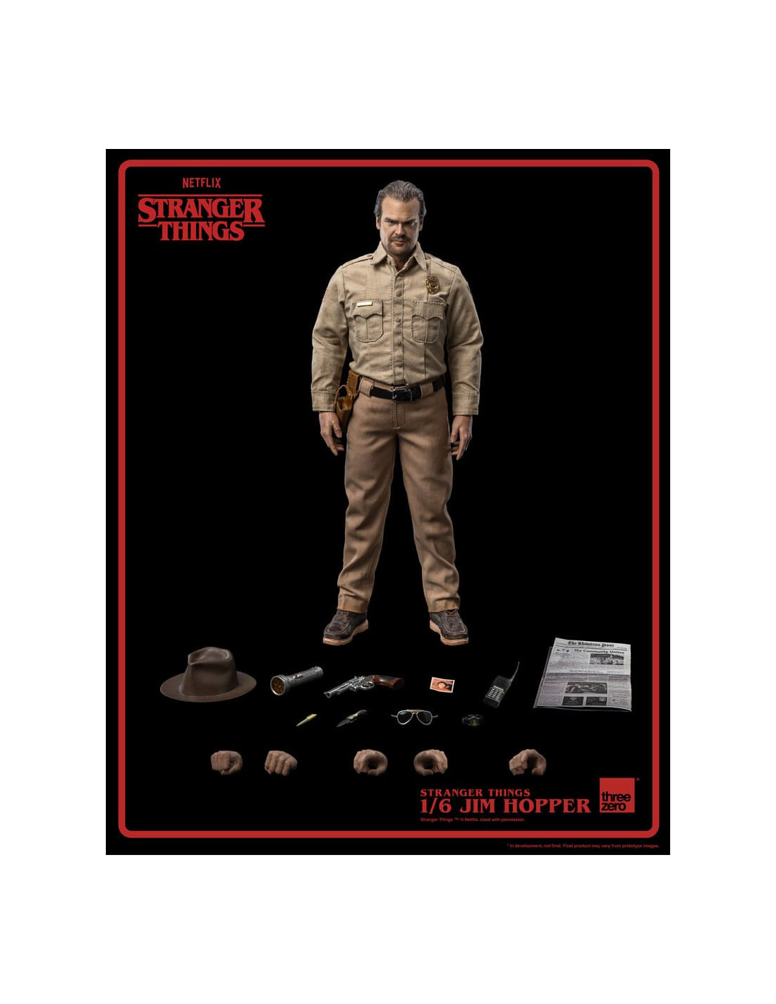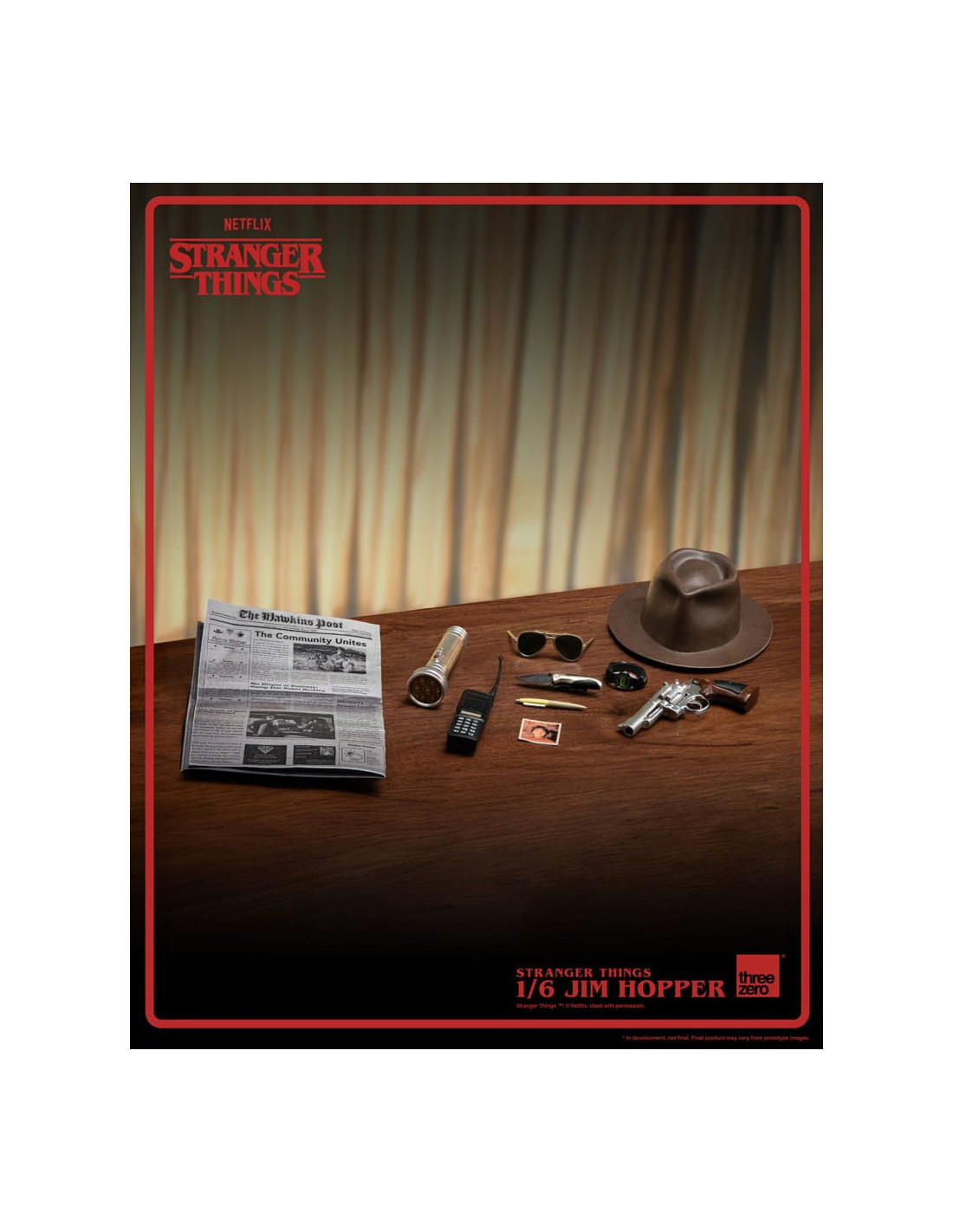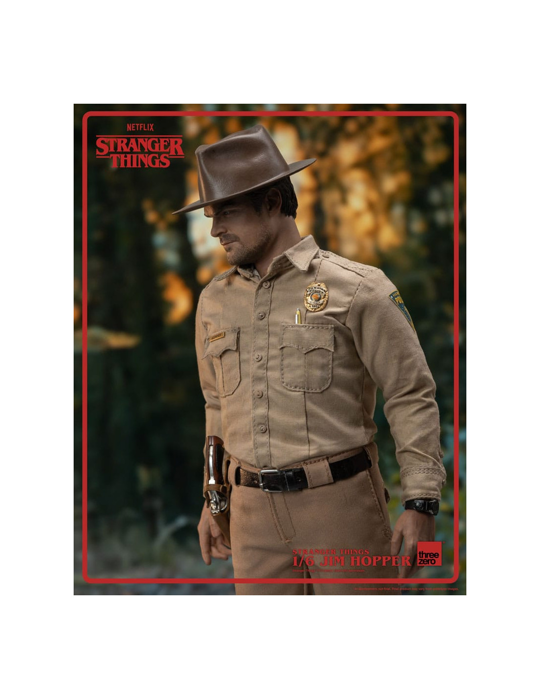 The Stranger Things - 1/6 Jim Hopper collectible figure stands approximately 12.5" (31.8cm) tall features a fully-articulated 1/6 original body with approximately 35 points of articulation. This collectible figure showcases precisely sculpted details and weathering effects, effectively capturing the powerful and tough presence of Jim Hopper.