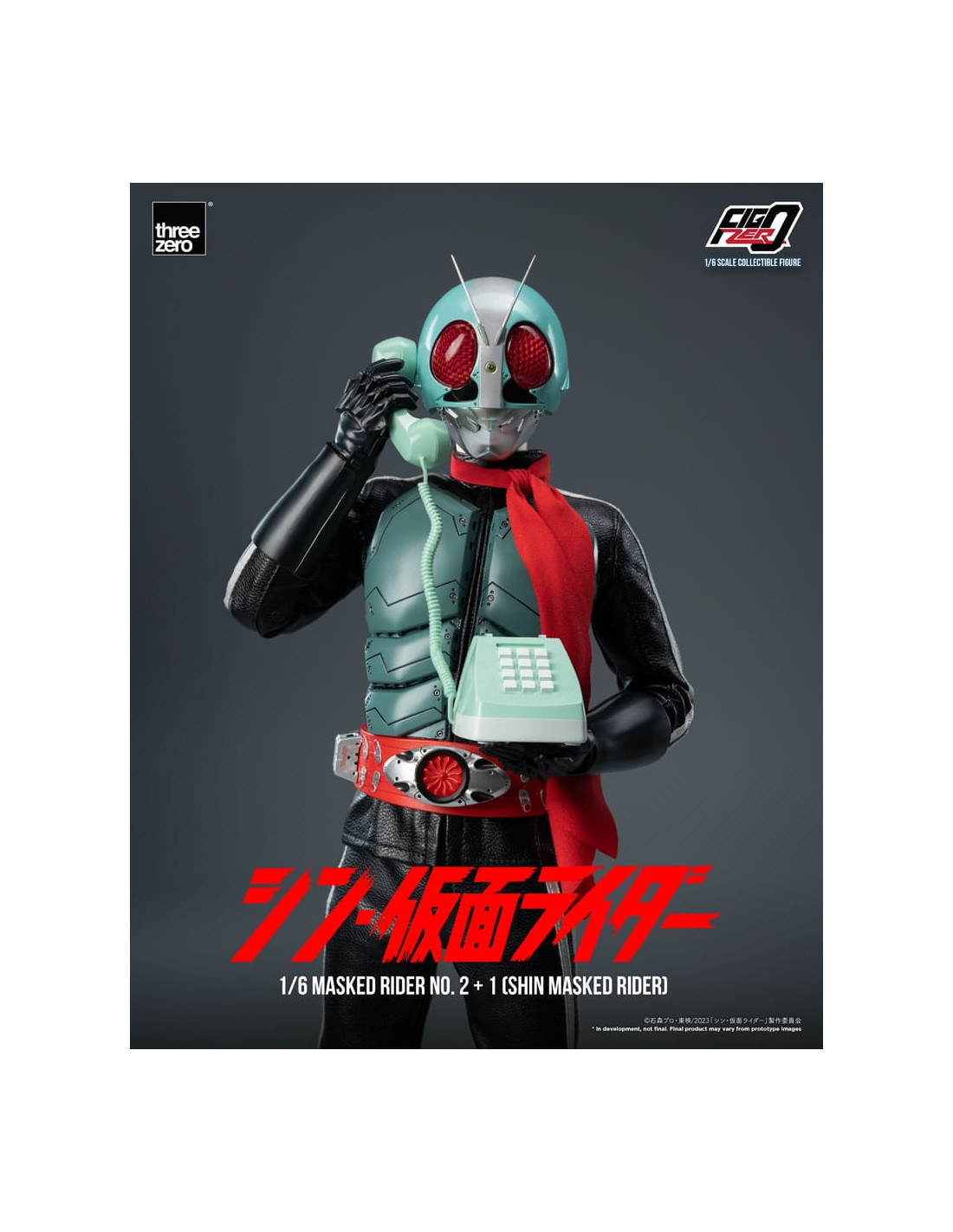 The FigZero 1/6 Masked Rider 2+1 (SHIN MASKED RIDER) comes with a combat suit outfit made by a combination of fabric and plastic parts. It also features a fabric scarf which contain wire inside at the edges, making them poseable. An LED light is installed inside the eyes located in the helmet for lighting effect. The jaw piece of the mask "Crusher" is articulated to be able to adjust length for mouth movement. He comes with two pairs of interchangeable boots, where one pair is for better articulation with parts separated at the ankles, and another pair where each boot is made as a single piece for a seamless appearance. Additional accessories included five pairs of interchangeable hands and two vintage-style telephones in different colors are included to capturing the appearance as seen in the "Moshi Moshi Telephone" promotional project for the film.