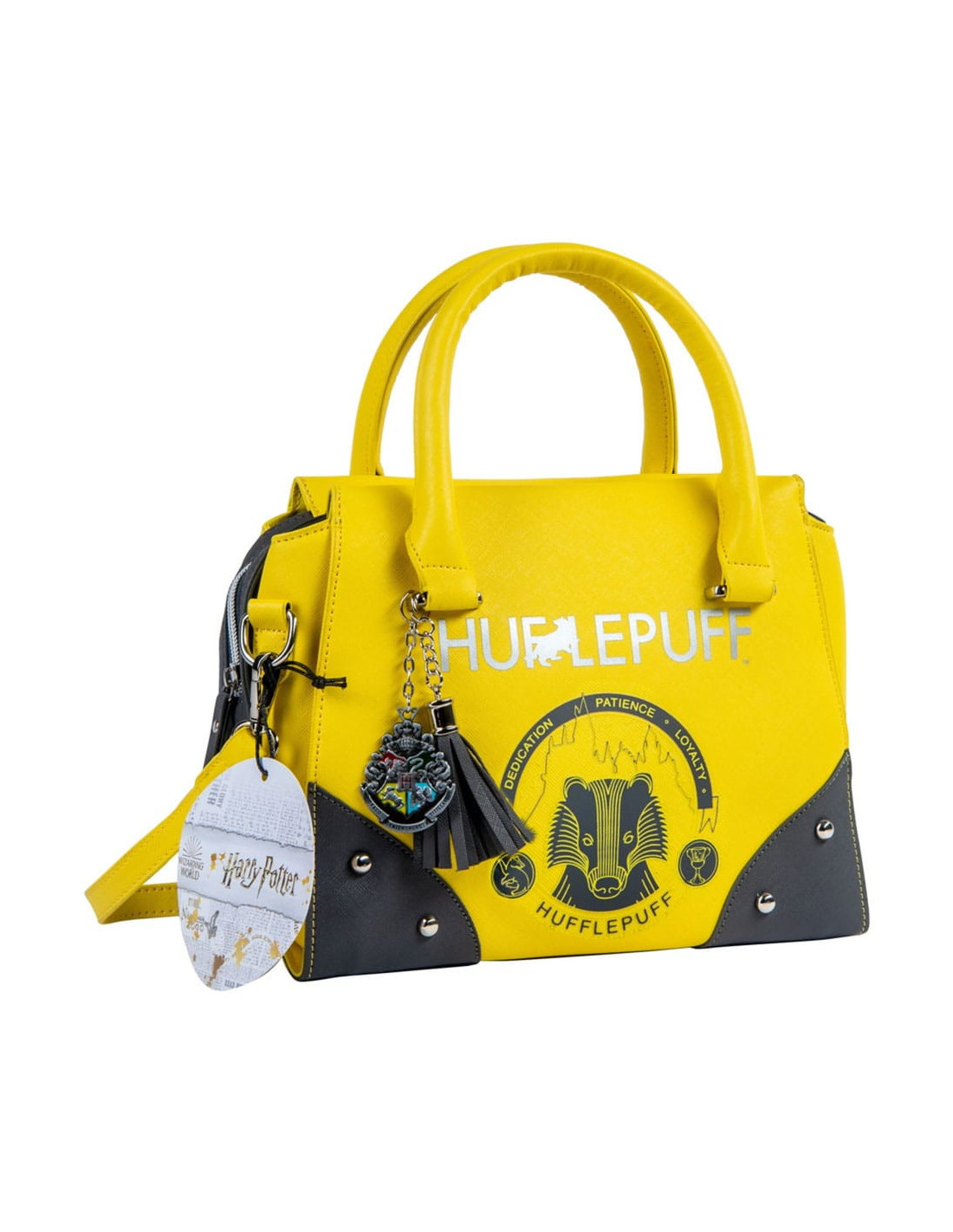 Every bag comes with a fully adjustable and removable matching shoulder strap, and a colourful Hogwarts crest metal charm with a matching grey tassel.