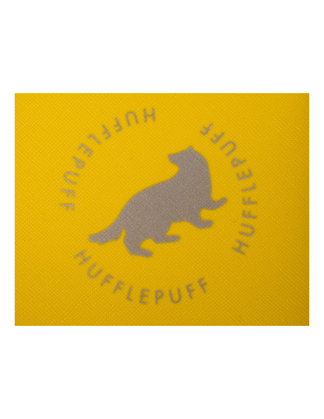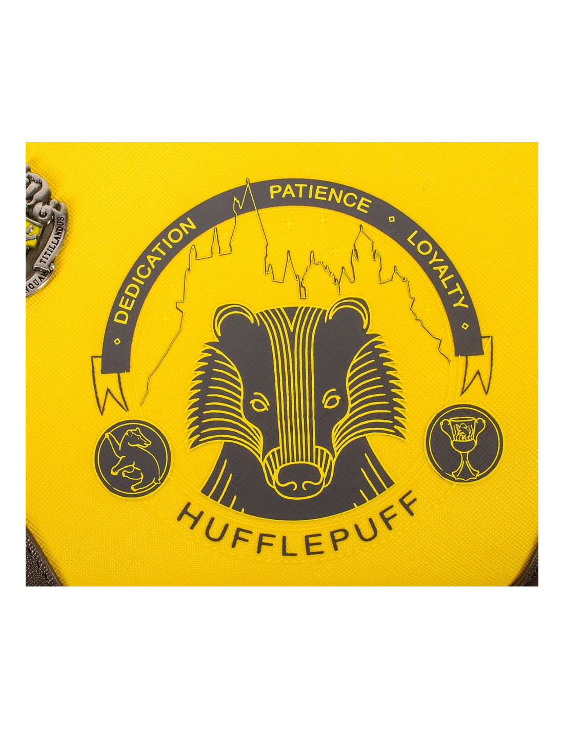 The sunshine yellow outer is complemented with charcoal accents on the corners and zip, and silver stud detailing. The front of this stylish bag is decorated with "Hufflepuff" in eye-catching silver lettering, and the Hufflepuff badger mascot surrounded by the house motto of "Dedication, Patience, Loyalty.". The back features a small and elegant logo of a stylised Badger silhouette, encircled by gold text.