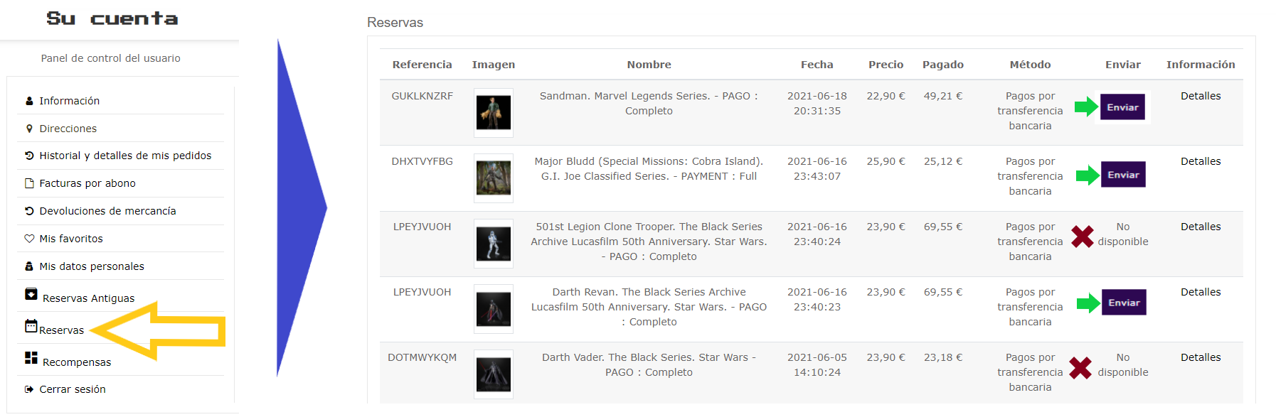 El nuevo sistema de reservas ha pasado por diferentes fases hasta funcionar al 100% y es posible que algunos artículos no quedaran registrados en su listado de reservas. Además, las reservas anteriores a abril de 2021 tampoco aparecerán. Contáctenos si desea conocer el estado de una reserva que no aparece en el listado.