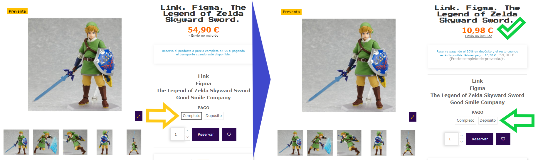 Todos nuestros artículos en preventa tienen la opción de pagar un depósito del 20% o el importe total. Para pagar sólo el depósito hay que entrar a la página del artículo y seleccionar la casilla correspondiente. El depósito es parte del pago y cuando se complete el proceso solo tendrá que abonarse el restante más el transporte.